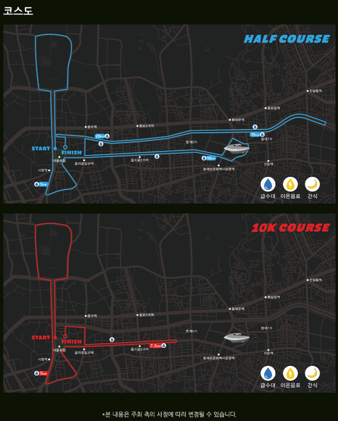 마블런서울2025는 하프코스(21.1km)와 10km 코스로 구성되어 있으며, 도심 마라톤 특성상 비교적 완만한 코스를 달리게 됩니다. 1만 명 규모의 대규모 참가 인원이 서울광장에 모이며, 캐릭터 코스튬을 입고 달리는 점이 주요 특징입니다.