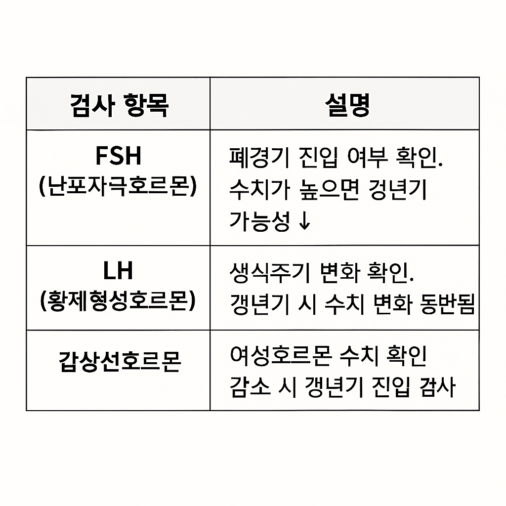 | FSH (난포자극호르몬) | 폐경기 진입 여부 확인. 수치가 높으면 갱년기 가능성 ↑ |