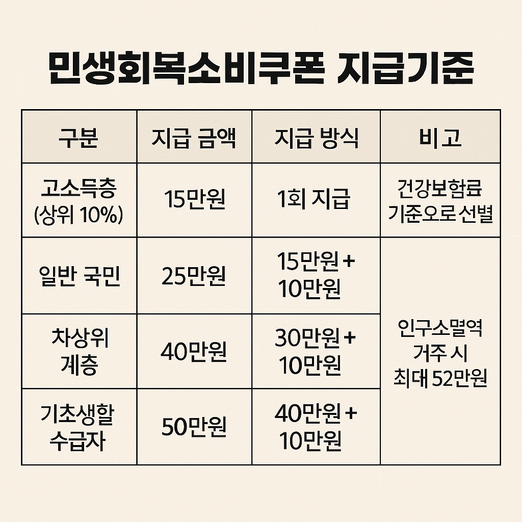 | 일반 국민 | 25만원 | 15만원 + 10만원 | 2회 분할 지급 |