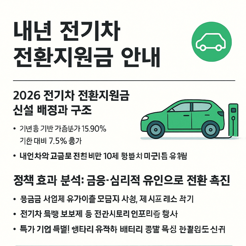 2026 전기차 전환지원금 신설과 관련 예산의 흐름을 중심으로, 구매융자·안심보험·인프라펀드를 망라한 실질적 지원 구조를 전문가 시각에서 분석했습니다. 전기차 전환을 계획 중인 분들에게 이번 예산 변화는 단순 할인 이상의 전략적 기회입니다. 지속 가능성과 접근성을 모두 잡는 이 정책을 놓치지 마세요.