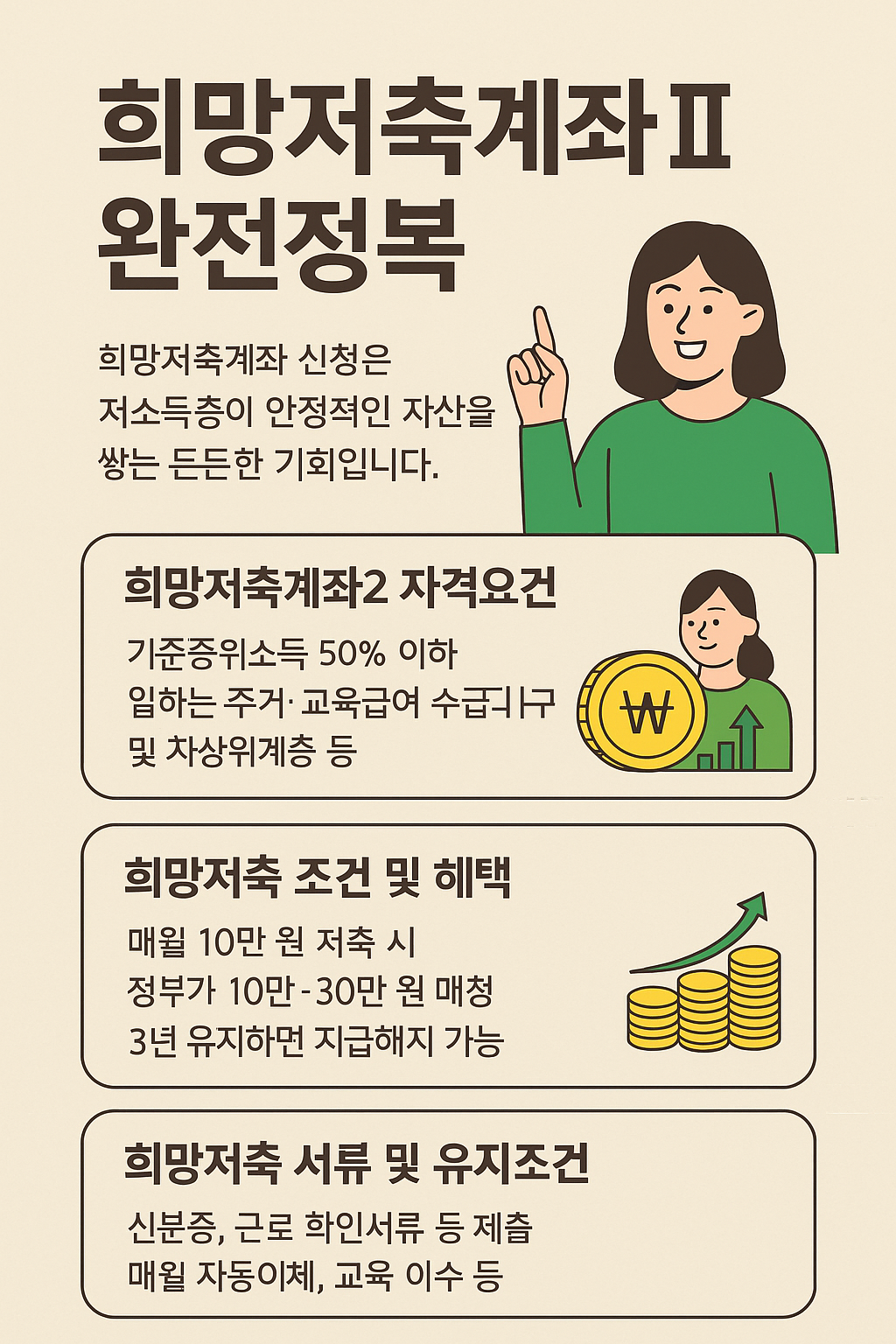 특히 희망저축계좌2는 자격요건부터 매칭금액, 중도 해지 수수료, 저축 유지조건까지 세밀한 기준이 존재하므로, 신청자에게 꼭 필요한 조건과 서류를 깊이 있게 분석해 드립니다.